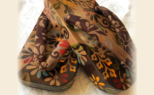 鼻緒の柄にあわせて水彩絵の具で全体に描いて上にカシューという塗料で仕上げています。