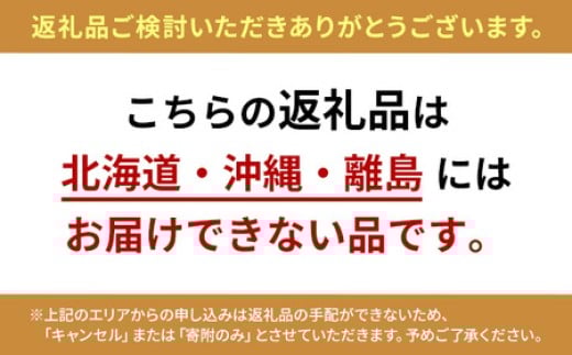 ※上記のエリアからの申し込みは返礼品の手配が出来ないため、「キャンセル」または「寄附のみ」とさせていただきます。予めご了承ください。
