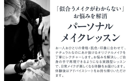 お顔立ちやお悩みに合わせたオリジナルメイクの提案・レクチャーを行います。使いやすいコスメの紹介や実践を通じて、普段のメイクをワンランクアップさせる内容です。アドバイスシート付き。