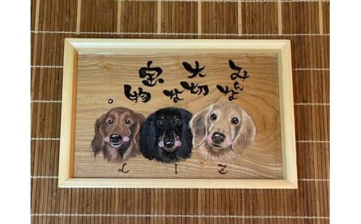 天然木のトレーに可愛いペットの似顔絵をお描きします。