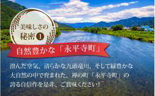 水が清らかで冷たい永平寺町内の農家の方が丹精込めて作ったお米です。澄んだ空気、清らかな九頭竜川、そして緑豊かな大自然の中で育まれた、禅の町永平寺町の誇る自信作を一度ご賞味ください!