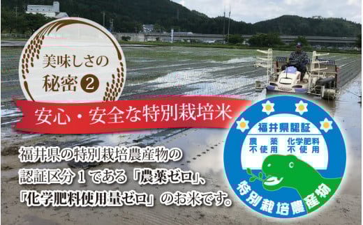 特別栽培米は、節減対象農薬の使用回数、化学肥料の窒素成分量を通常の栽培に比べて50%以下に減らして栽培されたお米です。その中でも、まちづくり株式会社ZENコネクトからお送りするお米は、「農薬ゼロ」「化学肥料使用量ゼロ」である福井県農産物認証区分「1」に認定されました!