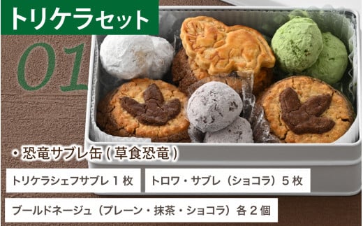 (トロワ・サブレ(ショコラ)5枚/ブールドネージュ(プレーン・抹茶・ショコラ)各2個/トリケラシェフサブレ1枚)