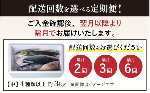【定期便 隔月2回】【朝獲り】漁師厳選 鮮魚セット (中) 4種類以上 約3kg 魚 詰め合わせ 鮮魚ボックス 直送 鮮魚 新鮮 煮物 焼き物 お造り 刺身 晩酌 食卓 BBQ 急速冷凍 真空パック 鮮魚セット 詰合せ 鮮魚店 厳選 お任せ 鮮度 産直 海鮮 加熱用 福井県 南越前町 越前 盛り合わせ おまかせ お楽しみ おつまみ おかず ご飯のお供 送料無料 さへい 河野 越前 北陸