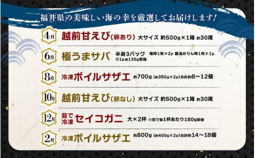 定期便 ≪年6回お届け≫ 海鮮定期便 偶数月にお届け 海鮮福袋 【産地直送 甘えび 甘海老 アマエビ サザエ さざえ セイコガニ かに 蟹 サバ 鯖 海の幸 貝 甲殻類 砂抜き済み 海鮮 魚介 酒の肴 つまみ 絶品 冷凍 福井】 [m17-g006]