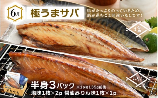 ・6月:極うまサバ 半身3パック 1パック約135g前後(塩味1枚×2パック 醤油みりん味1枚×1パック)サバ(ノルウェー産)