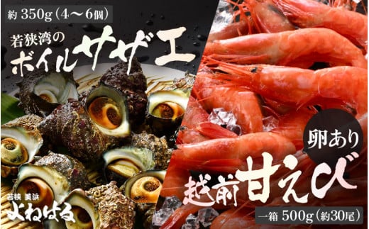 鮮度抜群の活サザエをボイルしたものと、ぷりっぷりの越前甘えびをお届けします。