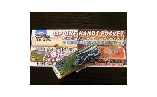 こちらは甲州石班澤(かじかざわ)【六郷IC】ここはハンコ産地の町で有名です。富士川の川幅がグッと狭くなった六郷の月見橋より見た、美しく大きな富士山風景だと思います。六郷商工会真向いにある老舗ハンコメーカー鈴木屋印材店プロデュース。ハンコ産地中部横断自動車道六郷インターを起点に、中部横断自動車道沿線ゆかりの地から望む北斎富士山を中心に、甲州石班澤【六郷IC】・身延川裏不二【身延山IC】・信州諏訪湖【佐久南IC】・東海道江尻田子の浦【富沢IC】・神奈川沖浪裏・凱風快晴の6点のオリジナル応援グッズを用意しました。とてもユニークなのは折り畳み式飾り台をセットすれば、インテリア装飾品としてじっくりと鑑賞して頂けます。もちろん普段使いのポケットサイフとして、アクセサリー、コインはもちろんリップ化粧ケースとしてお使いください。内側には、美しい金襴布地と鮮やかなレットベルベット張りにしてありますので、入れる品物をやさしく守ります。ハンコケース型ポケットサイズなのでどこにでも収納可能で耐久性も非常に高いです。