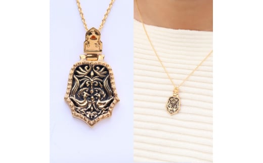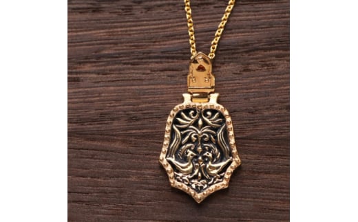 ネックレスはシルバーにゴールドメッキをした後に、黒エナメル加工をほどこして文様を浮き立たせ、重厚感のある仕上げにしました。