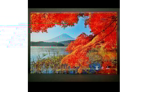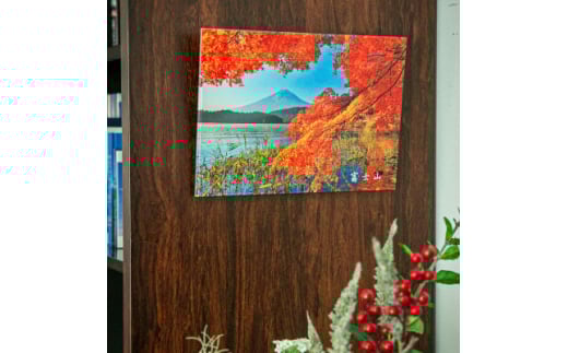 秋の河口湖畔で真っ赤に染まった紅葉と湖越しに見える薄らと雪化粧した富士山の写真データをアクリル板に印刷したパネルとなっております。