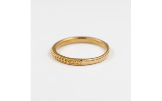 中央に並んだ小さなシャカ玉と両サイドを縁取る繊細なミル打ちが、クラシカルな表情を添える、純金のレールリングです。