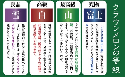 一本の木に1玉だけを厳選し、太陽・水・土の栄養を集中させて栽培するから香りが豊かで甘いメロンが実ります。王冠(クラウン)を戴くにふさわしい果物をぜひこの機会にお召し上がり下さい。『山等級』は味だけでなく外観の美しさも高品質です。
