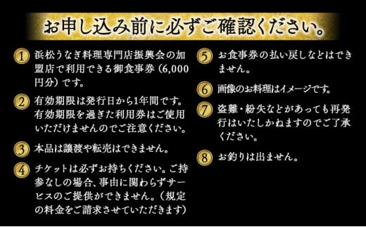 浜松うなぎ料理専門店振興会の加盟店で利用できるお食事券(6,000円分)です。