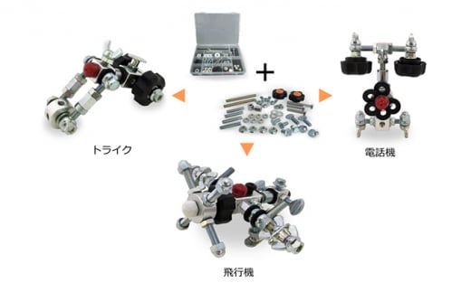 ねじとブロックを創造力を働かせて組合せるだけだから、子どもからお年寄りまで楽しむことができます。