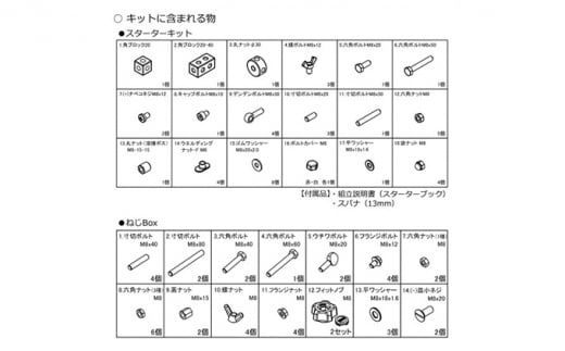 ブロック3種類:各1個、ねじ27種類:合計81個、組立説明書:1冊、スパナ:1個