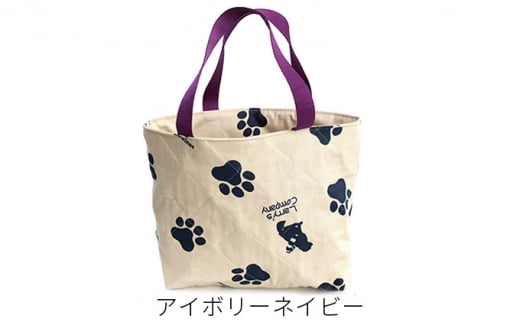 アイボリーネイビーのパウ柄に浮き輪ゴールデンのシルエットの防水トートバッグです。