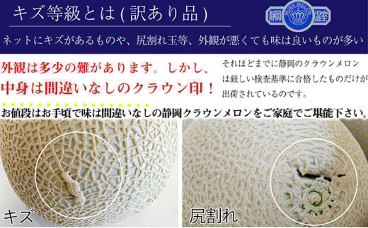 こちらの商品は訳あり商品となっています。外観に少しの難があるだけでも、キズ等級として扱われます。それほどまでにクラウンメロンの検査基準は厳しいのです。