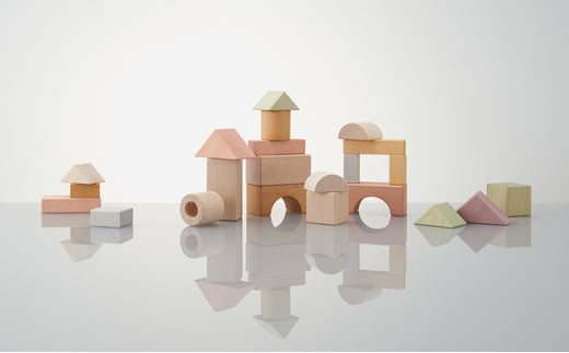 やわらかい色合いのつみきと、ぬくもりを感じる白木のつみきセットです。基尺40mmで32ピース。家の形の木箱が温かみを演出します。木箱の内側にプリントされたガイドラインがあるので、お片付けもパズル感覚で楽しめます。