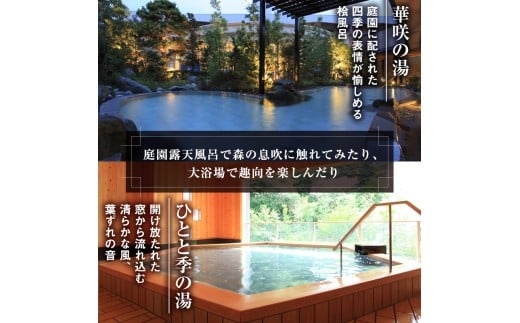 温泉は、広々とした露天風呂やシルクバス、サウナなどを有する「華咲の湯」と、ご宿泊者専用露天風呂「ひとと季の湯」でゆったりと温泉三昧をお楽しみいただけます。