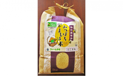 浜松市西区雄踏町の生産者「ファームカモ」の特別栽培米、ブランド名「みつばちまもる米」(人にも自然にもやさしいという意味)の粒大き目でほっこり、冷めても美味しい品種「にこまる」をお届けします。