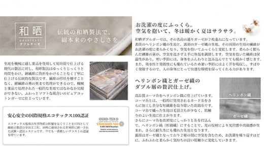 ・片面:綿100%を使用した和晒ダブルガーゼは、ヘリンボン織とガーゼ織のダブル層の贅沢な仕上げ。