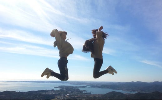 まるでパラグライダーで飛んでいるようなジャンプ写真も撮ることができます。三ヶ日みかんジュース付。