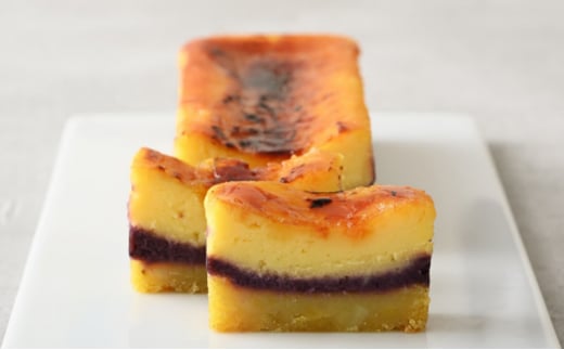 焼き芋ペーストを使用した濃厚な蜜芋の土台をベースに、味・見た目のアクセントとなる紫芋の層と、生クリームとクリームチーズをたっぷりと混ぜ込んだレアチーズケーキの層を重ねた、3層仕立てのお芋チーズテリーヌです。