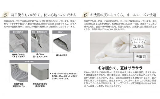 昔ながらの製法で、安心と安全にこだわった和晒ダブルガーゼ。 生地に無理なテンションをかけずに時間と手間ひまをかけてゆっくり加工したガーゼは、繊維がつぶれず、綿本来の持つ品質をそのまま生かしているので、洗うたびふわっとやわらかな風合いに変化します。生地の加工から縫製まですべて国内で加工しています。国際規格エコテックス認証の中でも一番厳しい「クラスI」の認証を得ています。