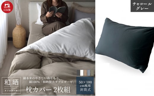 綿100% 和晒製法ダブルガーゼ 枕カバー2枚組 50×70cm枕用 チャコールグレー「和晒」 [№5786-5758]
