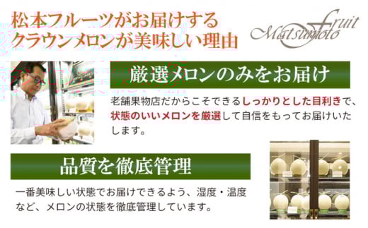 温暖な気候と日本有数の日照時間という恵まれた環境と長い歴史により培われた高い技術。この2つにより生まれた至極の一品です。栄養価を最大に高めるため1つの木から果実を1つに限定する、こだわりの収穫方法。完熟したクラウンメロンは上品な甘味と芳香があり、みずみずしく滑らかな口当たりです。等級は白級以上、大きさは1.4kg以上のものをお届けします。