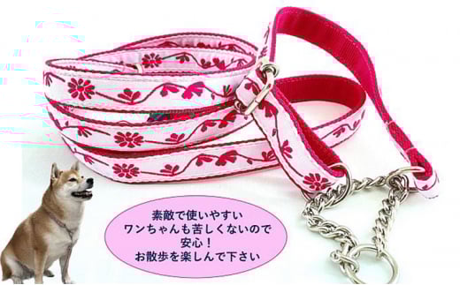 ハーフチョークカラーとリードのセット(マゼンダピンクフラワー) 中型犬用・Mサイズ
