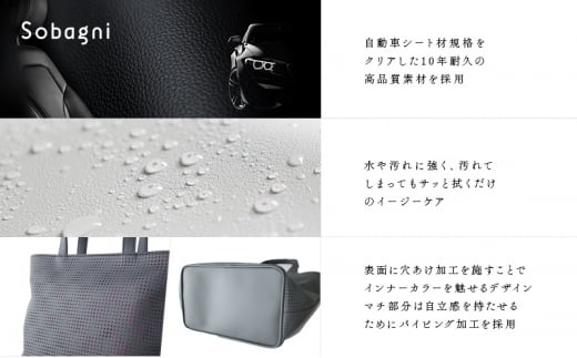 クルマのシート(座席)材にも使われている自社生産の高級エシカルマテリアルで仕立てた、ミニトートです。