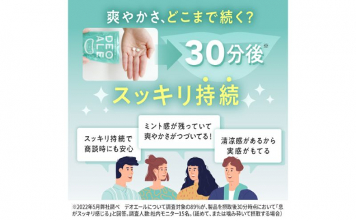 飲むだけでなく、じっくり舐めたり、噛んでもOKで、その場合は、すっきり感は約30分持続します。