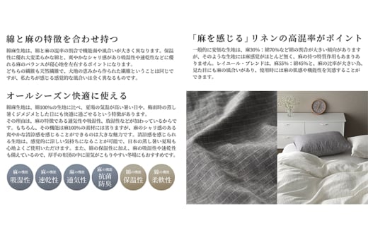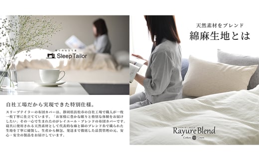 麻55%、綿45%の混紡糸で織られたレイユール・ブレンドは、麻の持つ肌離れの良い清涼感と、綿の優しいぬくもりを併せ持つ贅沢な布団カバーです。