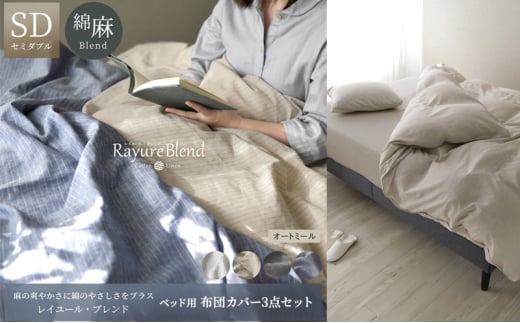 7. 日本製 ベッド用 布団カバー3点セット (掛け布団カバー・ボックスシーツ・枕カバー) セミダブルサイズ リネン&コットン 綿 麻 レイユール・ブレンド 「オートミール」 寝具 [№5786-5870]