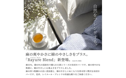 麻55%、綿45%の混紡糸で織られたレイユール・ブレンドは、麻の持つ肌離れの良い清涼感と、綿の優しいぬくもりを併せ持つ贅沢な布団カバーです。