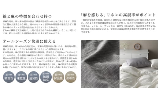 麻55%、綿45%の混紡糸で織られたレイユール・ブレンドは、麻の持つ肌離れの良い清涼感と、綿の優しいぬくもりを併せ持つ贅沢な布団カバーです。