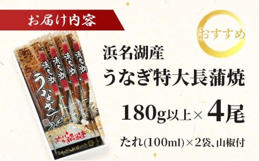 浜名湖産 うなぎ特大(180g以上) 長蒲焼真空パック4尾 計720g以上 たれ 山椒付 うなぎ 浜松市 静岡[№5360-0241]