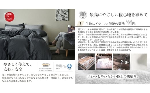 昔ながらの製法で、安心と安全にこだわった和晒ダブルガーゼ。 生地に無理なテンションをかけずに時間と手間ひまをかけてゆっくり加工したガーゼは、繊維がつぶれず、綿本来の持つ品質をそのまま生かしているので、洗うたびふわっとやわらかな風合いに変化します。生地の加工から縫製まですべて国内で加工しています。国際規格エコテックス認証の中でも一番厳しい「クラスI」の認証を得いています。