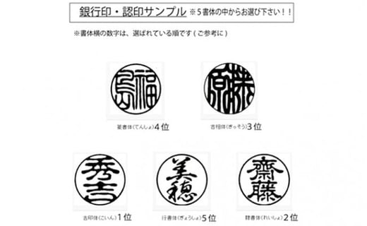 ※書体:篆書体(てんしょたい)、吉相体(きっそうたい)、古印体(こいんたい)、行書体(ぎょうしょたい)、隷書体(れいしょたい)はプルダウンから選択して下さい。