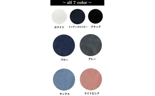 お申込みの際、サイズ:①L、②M、③Sから1種、カラー:①ホワイト、②インディゴネイビー、③ブルー、④ブラック、⑤ライトピンク、⑥サックス、⑦グレーから1色をお選びいただき、備考欄にご記入ください。