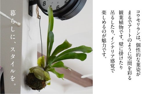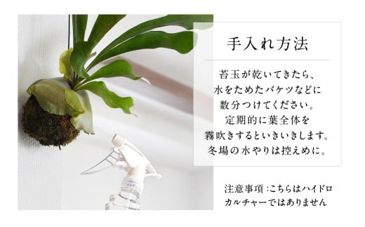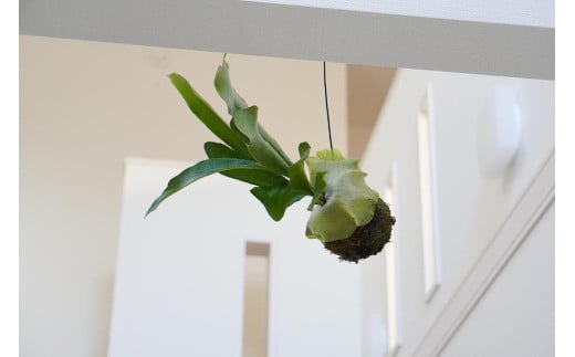 苔玉にコウモリランを植え込んだ商品で、壁に吊るしたりできます。