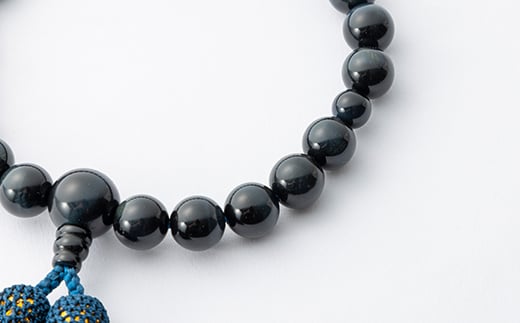日本名を『虎目石』タイガーアイは決断力と行動力を高める石ともいわれ、天然石の中でも特に男性に人気のあります。今回は珍しい色、ブルータイガーアイの出来るだけ色が濃く黒に近い原石を選び数珠にお仕立ていたしました。建物内の部屋などではほぼ黒色に見える濃紺色、日中屋外や照明の光が当たった時などは虎眼石特有のブルーグリーンの反射が見られます。