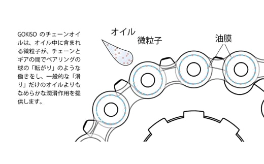 オイル中に含まれる固体潤滑材の微粒子が、チェーンプレート内部やチェーンとギアの間でベアリングの球のように転がり、チェーンの駆動抵抗を減らします。一般的な「滑り」だけのオイルよりもなめらかな潤滑作用を提供致します。 変速時のチェーンの横方向への移動でも、その滑らかさをご体感頂けます。