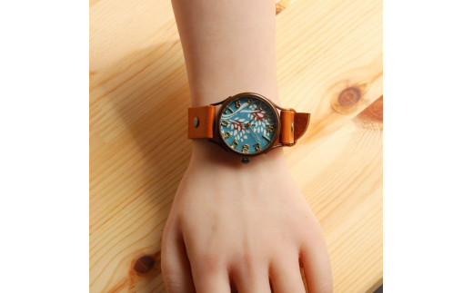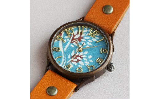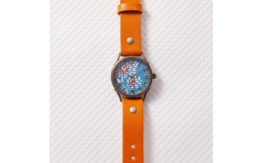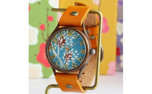 伝統工芸文様【南天】の文字盤が美しい 和染千代紙で作ったハンドメイドウォッチ ベルトカラー:蜜柑 WJ004L 南天-蜜柑