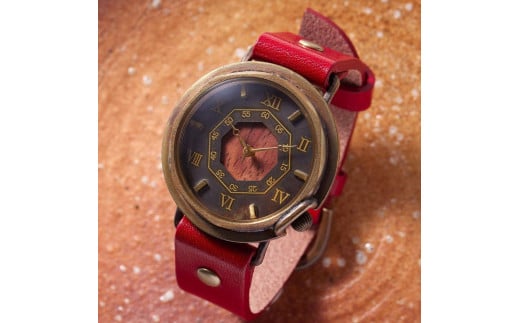 天然樹木【ブビンカ】と八角形デザインの文字盤が可愛いハンドメイドウォッチ Mサイズ ベルトカラー:赤 WB007M W2-赤