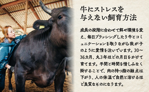 平井牛の特徴は、なんといっても月齢の長さと牛にストレスを与えない飼育方法です。成長の段階に合わせて餌や環境を変え、毎日ブラッシングしたり牛とコミュニケーションを取りながら我が子のように愛情を注いでいます。30~36カ月、丸3年ほどの月日をかけて育てます。
