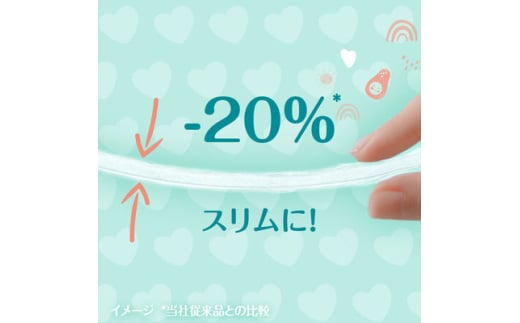 パンパース史上初1、 -20% スリム吸収体* *当社従来品との比較もこもこしにくく、動きやすい!