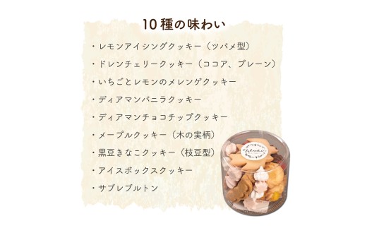 小麦粉、発酵バター、てんさい糖、卵、アーモンド、はちみつ、バニラ、チョコチップ、ココア、レモン、ゲランドの塩、メープルシュガー、ドレンチェリー、黒豆きなこ、イチゴパウダー