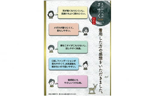 地場生産の当社オリジナル純国産商品。植物由来の天然繊維『和紙』を口元に使用。素材は、抗菌消臭加工された綿繊維を使用。効果の目安は、洗濯50回程度。顔にフィットする立体的な編み方で無縫製。毛羽がなく皮膚が敏感な方、口紅、ファンデーションの汚れが気になる方にオススメ商品。